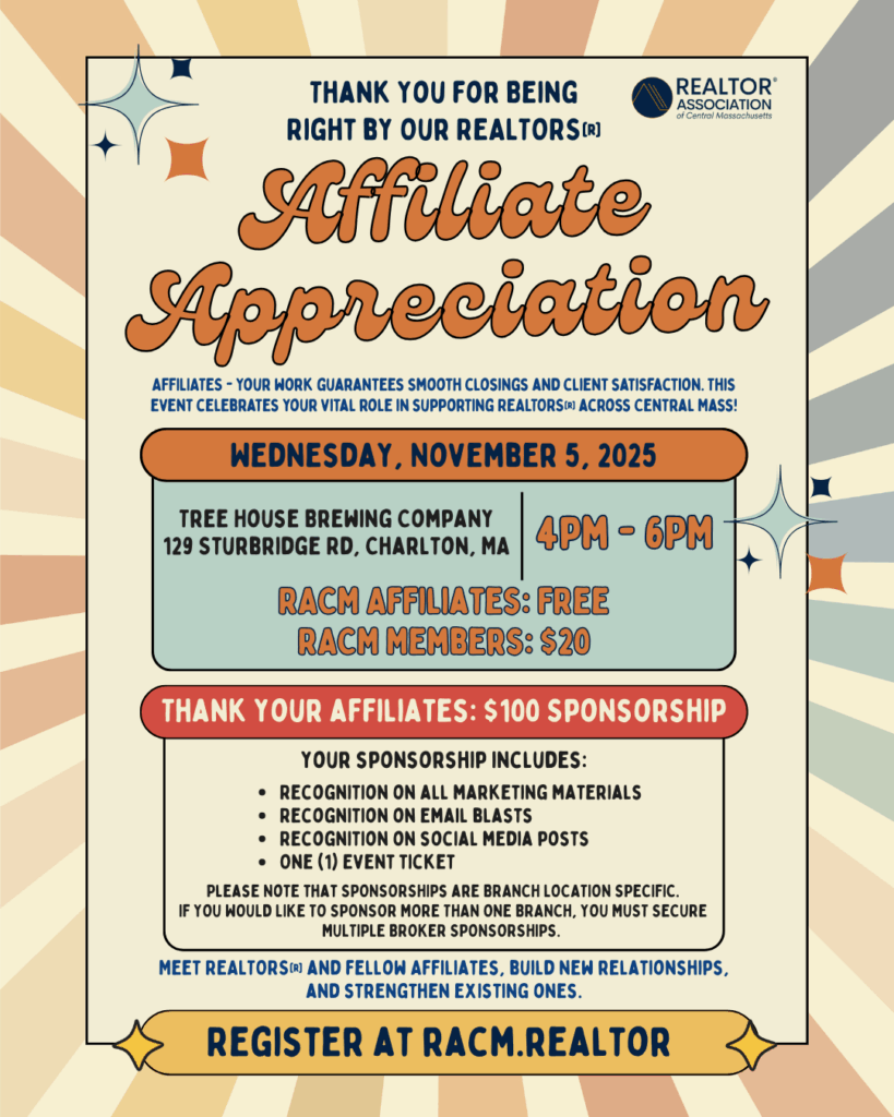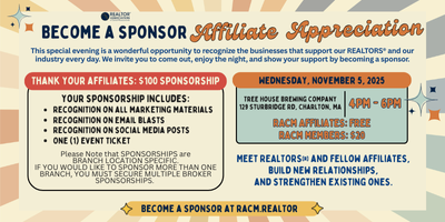Show your appreciation by sponsoring our 2025 Affiliate Appreciation event at Tree House Brewing Company in Charlton, MA. Available to all Brokers and Agents.